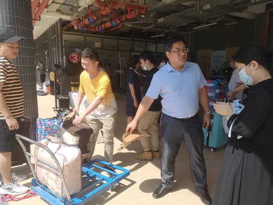 搬迁工作7月13日正式开始,王锦绣副校长与学校其他领导在管委会覃少冰副主任、段晓聪副主任、付蔚莹副主任的陪同下亲临学生宿舍关心行李搬运情况,协调行李搬运的流程及安排。