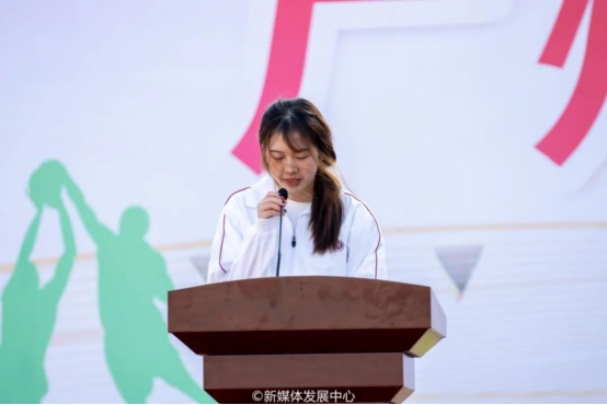 运动员代表王可可同学进行宣誓:必将严格遵守比赛规则,坚决服从裁判,尊重对手,尊重观众,以饱满的热情认真比赛,发扬顽强拼搏精神,胜不骄败不馁,赛出风格,赛出水平,发挥出最佳成绩。