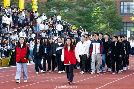 第五方阵为传播与传媒学院方阵,雄心壮志在,少年当勇猛,挥洒汗水展雄风,青春辉煌展未来。