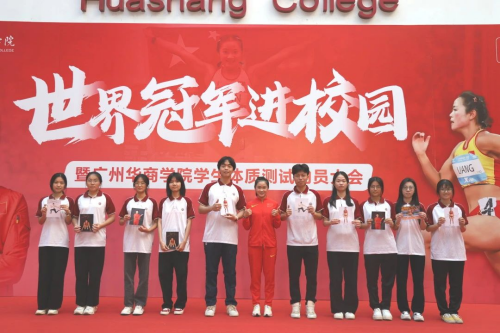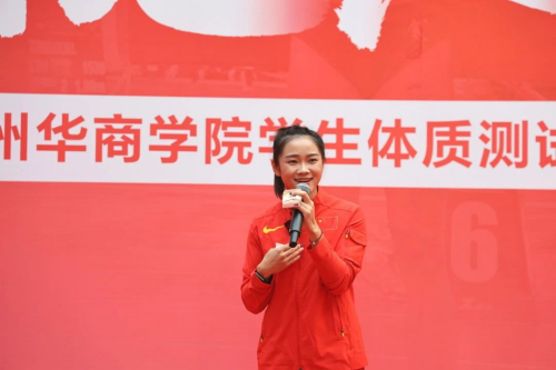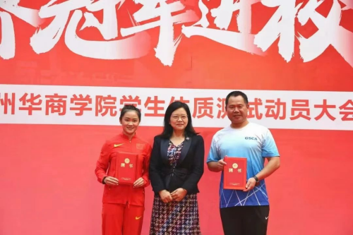 10月29日下午,世界冠军进校园暨广州华商学院学生体质测试动员大会以线上+线下的方式在广州校区图书馆举行。世界冠军、中国田径短跑运动员梁小静莅临华商,作为特邀“体育老师”分享其运动生涯与夺冠背后的奋斗历程。世界冠军梁小静,广东省体能协会常务副会长兼秘书长韩春远,增城文旅体中心副主任朱庆伟,广州博润体育科技有限公司、赛事运营副总经理刘义勇,广州华商学院党委书记陈玉欢,学校党委委员、副校长许娜,以及各职能部门负责人、二级学院代表出席本次大会,与500余名师生代表共上一堂“体育课”。本次会议由学校副校长许娜主持。