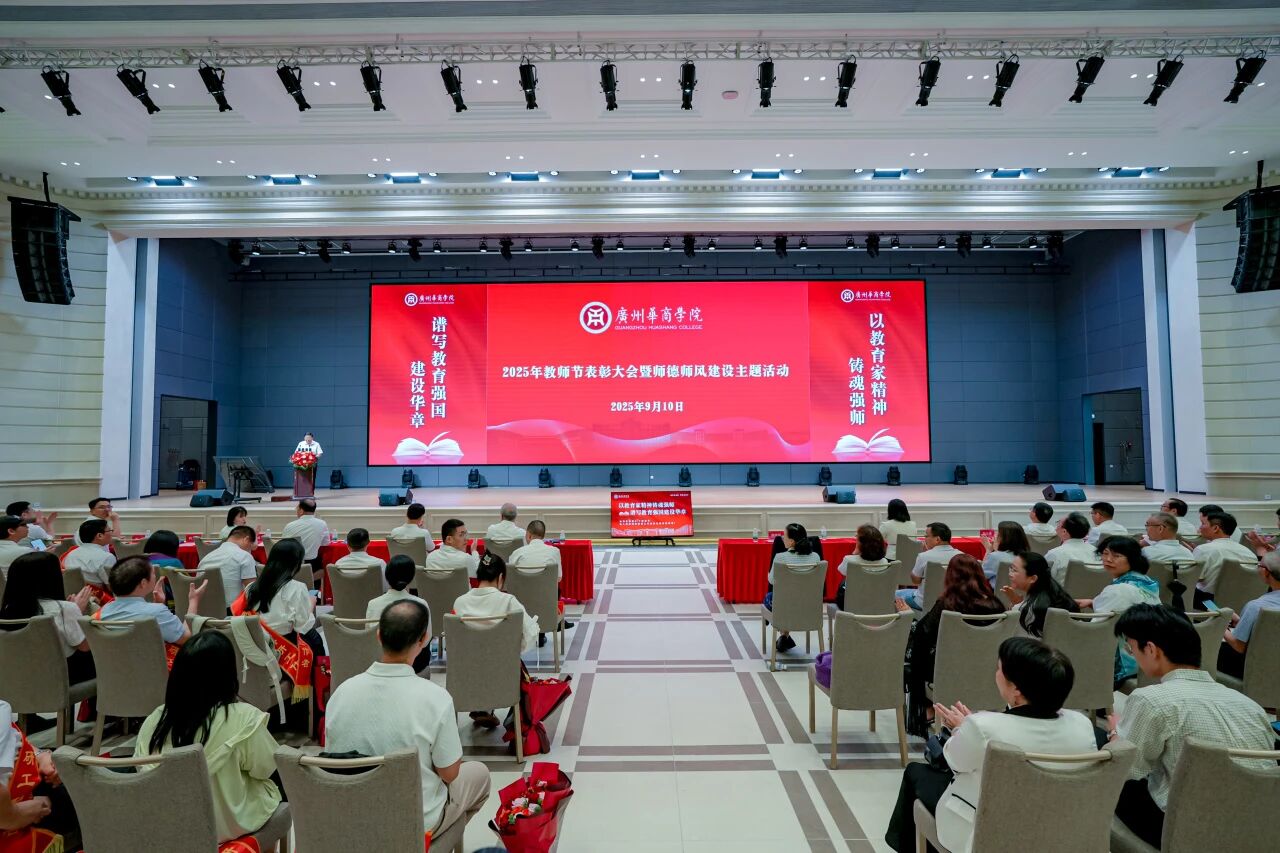 为大力弘扬教育家精神,提升全校教师立德树人的使命感、责任感和荣誉感,2025年9月10日下午,广州华商学院2025年教师节表彰大会暨师德师风建设主题活动在广州校区新国际会议中心大礼堂举行。本次活动以“以教育家精神铸魂强师,谱写教育强国建设华章”为主题,集团领导、学校领导、学校顾问,全体中层干部、受表彰教职工、教师代表及学生代表齐聚一堂,共同致敬教育工作者,共话学校教育事业发展新蓝图。大会由副校长范忠宝主持。