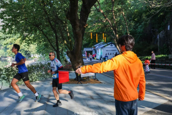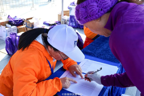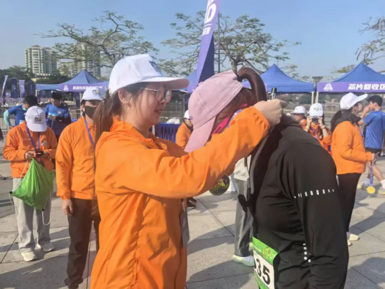 //志愿者在终点拱门处为冲线运动员佩戴奖牌//