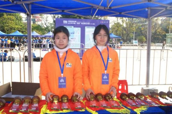 //志愿者在颁奖仪式上为嘉宾送上颁奖物资//