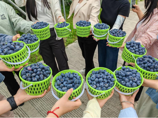 午餐结束后,活动进入最令人期待的蓝莓采摘环节。老师们满怀欣喜地走进蓝莓基地,放眼望去,一簇簇蓝莓挂满枝头,饱满圆润、色泽诱人,在阳光的映照下泛着晶莹的光泽。大家手提果篮,兴致勃勃地穿梭于蓝莓丛间,仔细挑选着成熟的果实,一边采摘品尝,一边拍照留念。蓝天白云下,绿意盎然的田园间,老师们三五成群,欢声笑语不断,尽情享受着大自然的馈赠与田园采摘的乐趣。老师们还不忘分享采摘心得,相互交流挑选蓝莓的小技巧,现场气氛轻松愉悦,洋溢着满满的幸福感。
