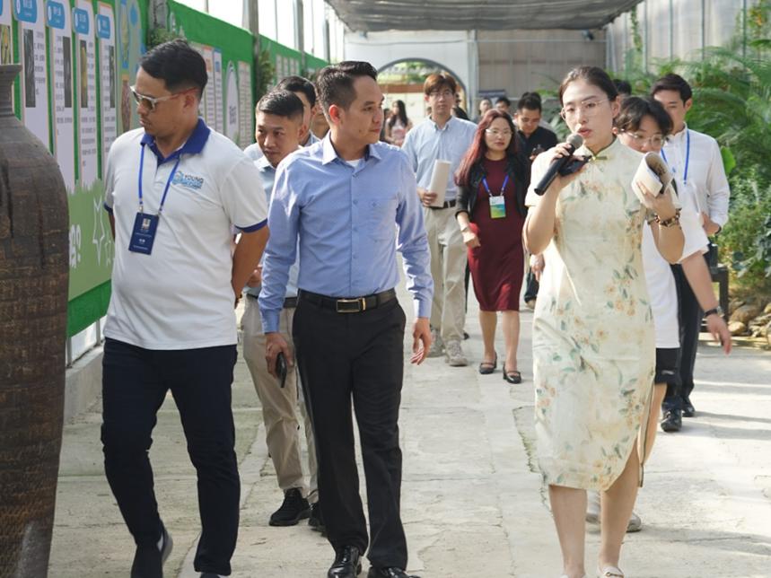 本次雅兰芳站路线讲解,师生志愿者们做好充分准备,精神饱满为到访人员提供外语翻译服务。“大湾区兰花看四会,四会兰花看石狗,石狗镇位于四会市中西部,地处北回归线以南,是四会市最早种植兰花的地方。”“四会市以兰为媒,将典雅的兰花元素融入到生活中去,让大家更好地认识兰花、感受兰花而打造的一系列文创产品,也是四会发展兰花产业全产业链的一种创新与尝试。”从雅兰芳大厅,到雅兰芳花场;从兰文化展示区,到兰花科普长廊,我校师生志愿者用心用情耐心讲解,为大家详细介绍四会兰花产业发展、石狗镇乡村振兴、经济发展的情况。我校学生志愿者们运用专业所学,用行动凸显语言的力量,绘声绘色地为大家讲述四会兰花、文化赋能乡村振兴的故事,搭建起中外交流的桥梁,帮助东盟青年、企业家深入了解中国、粤港澳大湾区以及肇庆的投资环境。