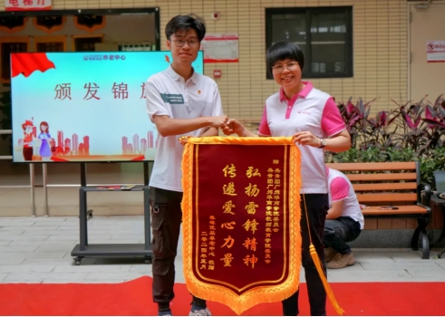 四会市春晖优品养老中心为我校团委颁发“弘扬雷锋精神 传递爱心力量”锦旗。