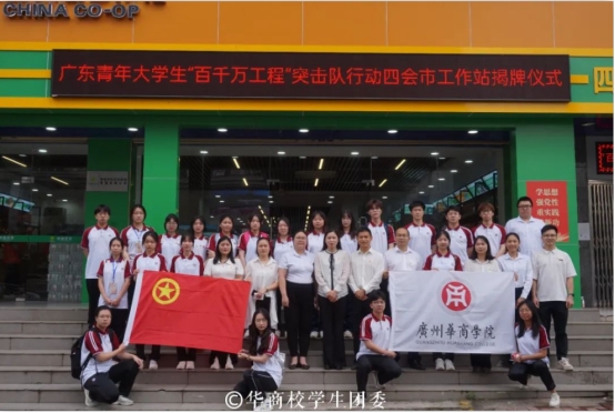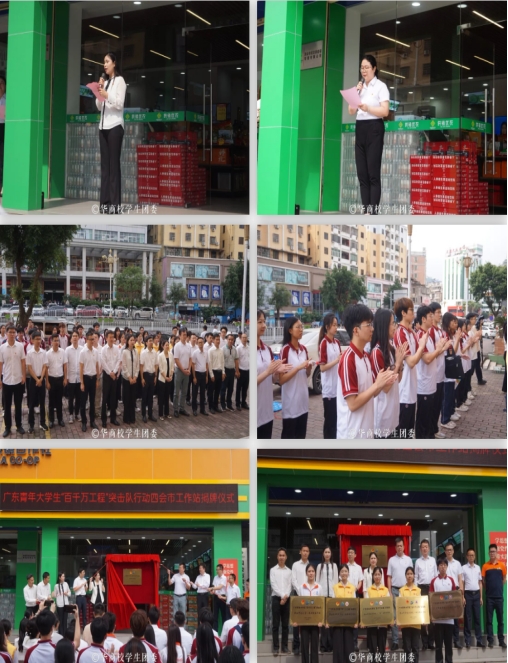 揭牌仪式上,团四会市委书记崔冰娜对广东青年大学生“百千万工程”突击队行动四会市工作站进行详细介绍。华商学子们全神贯注,认真聆听,展现积极进取的精神风貌。四会市委副书记吴鋆及团四会市委、黄田镇、市供销社等主要负责同志进行揭牌仪式,我校“小旅进镇”突击队和直播突击队成功入驻四会市工作站。
