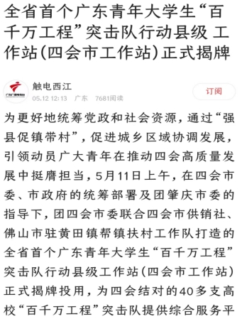 各青年突击队要充分利用好工作站以及广东青年大学生“百千万工程”突击队校地通小程序,实现高校团队与县镇需求精准结对、长期结对,发挥高校团队专业优势和青年创意优势,以青年之力提高产业发展,以青年之声讲好四会故事,在四会高质量发展中挺膺担当,为推进“百千万工程”建设贡献青春力量。