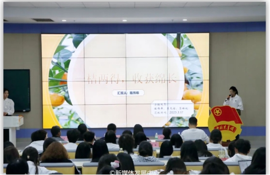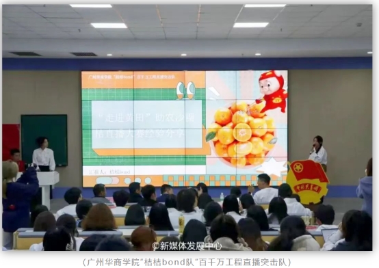 广州华商学院“一桔两得”、“桔桔bond队”、“桔星高照队”百千万工程直播突击队三支优秀团队代表依次上台作经验分享。在四会市黄田沙糖桔直播大赛中,我校3支 “百千万工程”直播突击队以 “专业+创意+协同”三连招点燃助农热潮。通过产地溯源直播、IP形象 “桔桔 Bond”、沉浸式音乐互动等创新形式,让四会沙糖桔顺利“破圈”,远销不同市场。
