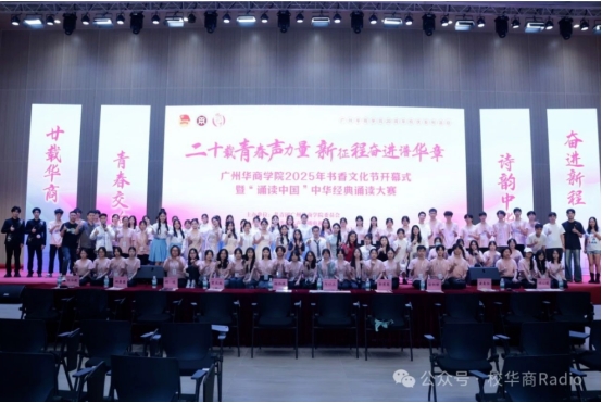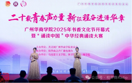 为弘扬中华优秀传统文化,引导师生深入感受中华文化博大精深,以语言艺术凝聚文化自信,以青春之声传递家国情怀,强化校园文化建设,以实际行动助力学校本科合格评估工作和迎接20周年校庆,4月19日晚,在学校团委指导下,校华商之声广播电视台在肇庆校区2号楼报告厅举办“二十载青春声力量,新征程奋进谱华章”——广州华商学院校园书香文化节开幕式暨2025年中华经典诵读大赛。