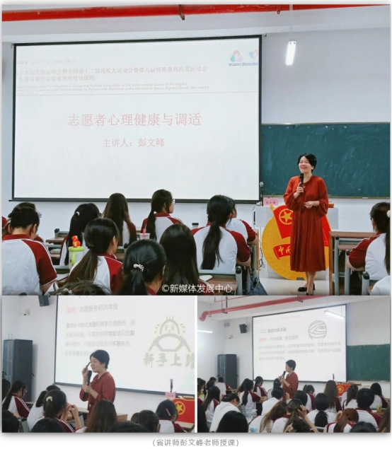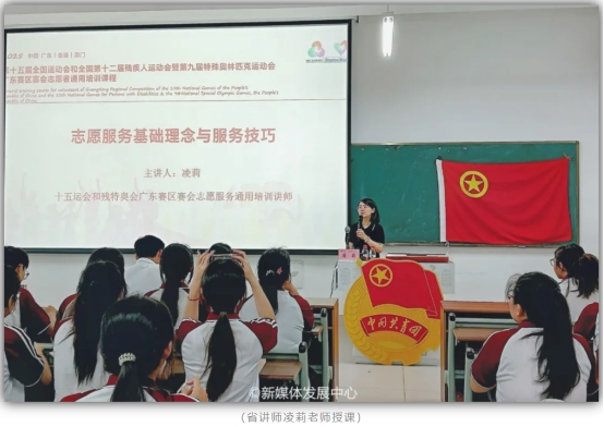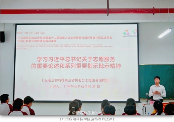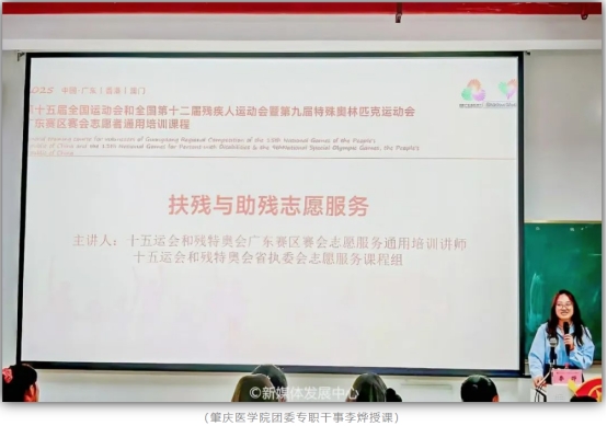 4月19日,在肇庆校区16号楼104,我校团委干事何以立以《全运会、残特奥会概括与志愿者岗位介绍》为题,通过影像资料与数据图表生动展现两大赛事的发展脉络与社会价值,并详细介绍了全运会、残特奥会志愿者的种类及各自的岗位职责,让志愿者们系统地了解志愿服务工作的要求及志愿者的责任与使命,以期更加准确地匹配十五运会和残特奥会志愿服务相关工作需求。