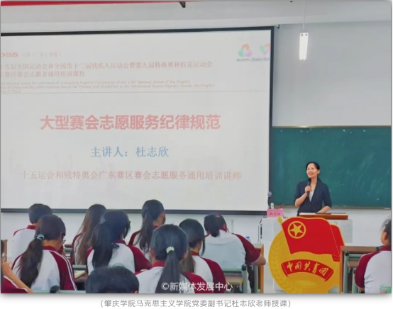 4月19日,在肇庆校区16号楼104,肇庆学院马克思主义学院党委副书记杜志欣以《大型赛会志愿服务纪律规范》为主题,立足赛事服务工作的规范性与特殊性,深入阐释了纪律建设在志愿服务中的核心地位与实践路径,为志愿者们即将投身的服务工作提供了有力的指导和支持,他勉励志愿者以“使命必达”的信念践行岗位职责,用严明的纪律作风展现青年志愿者的专业素养,在服务中树标杆、作表率,为赛会成功举办贡献坚实力量。