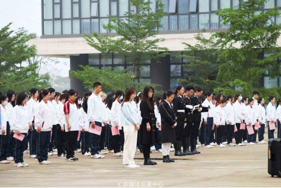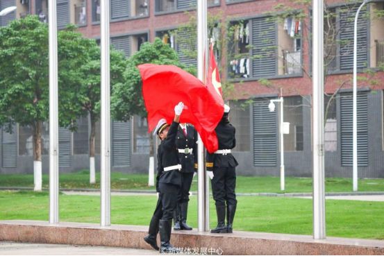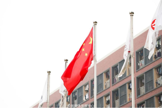 在场师生庄严肃穆,鲜红的国旗,伴随庄严雄壮的国歌声,在空中冉冉升起。