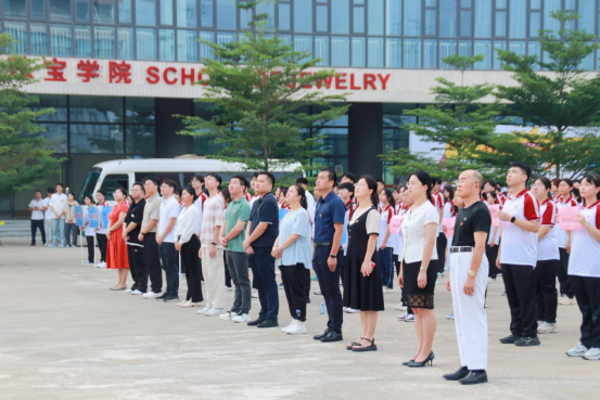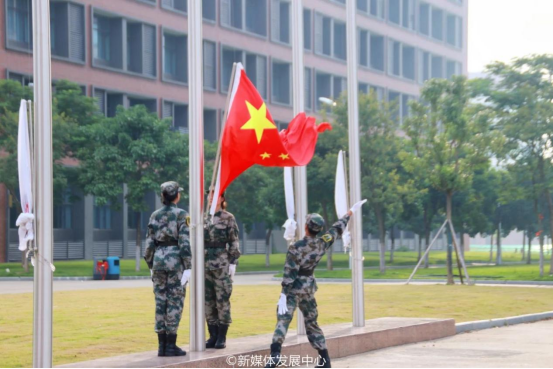 全场庄严肃穆,伴随初升的朝阳,齐唱雄壮的国歌,注视着国旗冉冉上升。