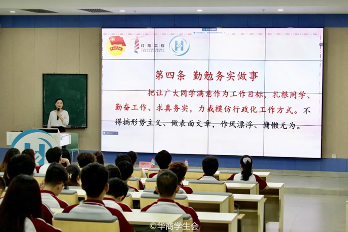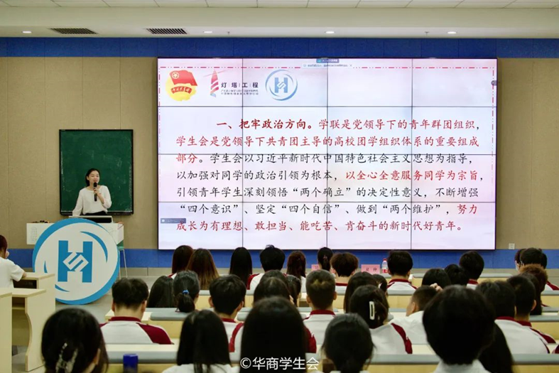 2023年10月17日12:30,广州华商学院学生会校院两级学生会工作培训会顺利举行,校学生会指导老师夏仲、校团委专职团干陈巧巧老师及两校区两级学生会工作人员线下线上同步参与。
