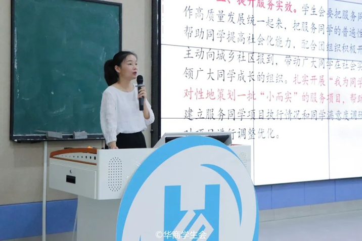 夏仲老师作2023年秋季学期学生会重点工作介绍。她将学生会重点工作分为九个要点展开介绍,围绕学习习近平新时代中国特色社会主义思想,结合习近平总书记关于青年工作的重要思想,持续深化专题学习,把深入学习贯彻习近平同团中央新一届领导班子成员集体谈话的重要讲话精神,学习团十九大精神作为全省学联学生会功能型团支部的学习重点。打通“校-院-班”三级联动,以“最后一公里”为关键,从而引领同学积极投身于全面发展。