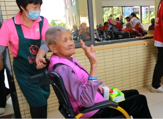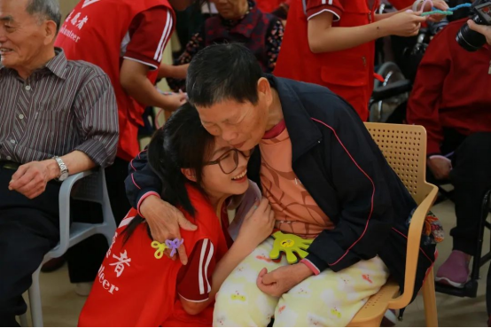 离别时刻,老人依依不舍地与志愿者们聊天,志愿者们搀扶老人离场,与老人挥手告别,并给老人送上真挚的祝福,祝愿老人们福寿安康、笑颜常驻,期待下一次相遇。