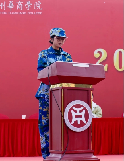 学生代表邓诗晴同学上台发言,表达了对军训的期待和决心。她的决心和勇气,将激励着全体同学在军训中奋勇前行,以优异的成绩完成这次军训任务。