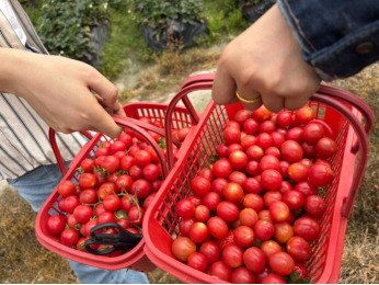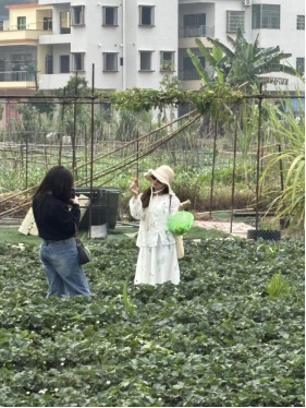 聚餐结束后,教师们来到了贞山旅游区附近的采摘园,开启了一场惬意的采摘之旅。采摘园内的草莓、圣女果和甘蔗长势喜人,一片丰收的景象。在这里,女教师们手提篮子,穿梭在藤蔓间,挑选着心仪的果实。大家在品尝的同时,也不忘拍照留念,记录下这美好的时光。