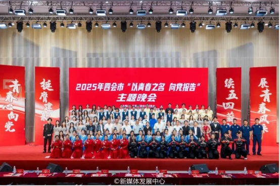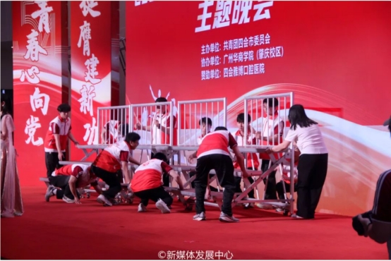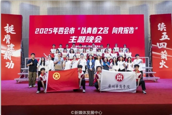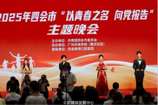 为深入学习贯彻习近平新时代中国特色社会主义思想和党的二十大精神,继承和弘扬五四精神,展示四会市团员青年的青春风采,奏响新时代的青春之歌,2025年4月27日晚,由共青团四会市委员会主办,广州华商学院协办,四会雅博口腔医院赞助的“2025年四会市‘以青春之名 向党报告’主题晚会”在广州华商学院肇庆校区顺利举办。四会市委副书记、市长吴鋆,四会市委常委、组织部部长范小普,四会市人民政府副市长黎一斐,广州华商学院肇庆校区党委书记苏宁,校长助理、肇庆校区管委会常务副主任覃少冰,后勤保卫办公室主任徐强等领导出席活动。全市各领域团干部代表,各界青年代表等600余人到场观看。晚会由我校张富成、宋佳、陈楚烽、吴敏琦同学主持。