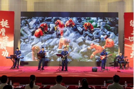 四会市东城消防救援站团支部带来的乐队表演《勋章》《光辉岁月》,以激昂的旋律致敬在火光中镌刻荣光的青春身影,呈现了消防员们英勇无畏、守护人民的奉献精神。