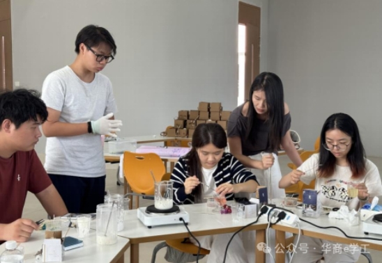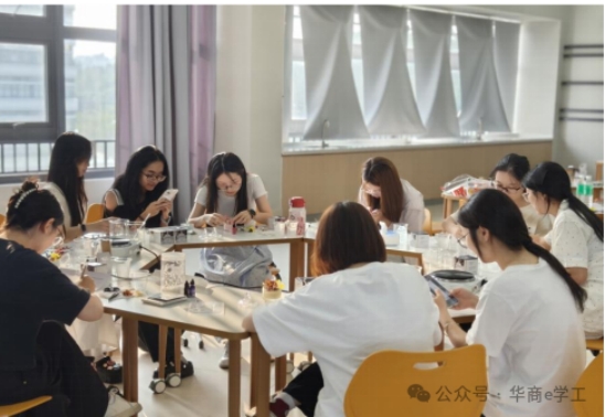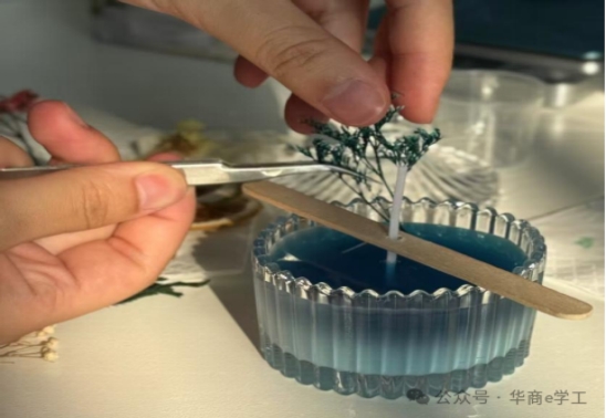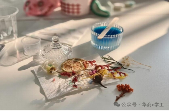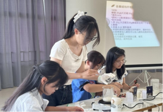 生活最动人的当然属于亲手创作环节,这正是“四会八能”中“会实践、会合作”的鲜活体现。同学们手持试纸细嗅五种香料,在交流中碰撞香方灵感;按配比称量蜂蜡与大豆蜡、耐心等待融化、精准倒入模具调色,每一步都藏着“精益求精”的华商态度;提前裁剪干花、待蜡液凝固时细心摆盘,指尖的专注里,是对“美”的追求与创造。刘老师携香薰教师团队全程在旁指导,既保障了实践安全,更用耐心传递着书院“因材施教”的育人温度。