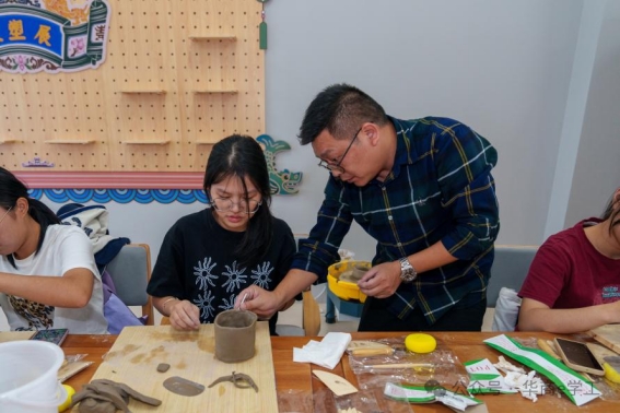 技艺点睛:在手捏成型阶段,郭步老师娴熟运用雕刻刀,将校徽纹样嵌于坯体,并讲解“形意结合”的设计哲学——例如香炉造型象征学术薪火相传,笔筒纹路呼应校园建筑线条。