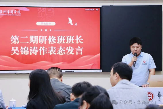 第二期研修班班长吴锦涛代表全体学员表态:全体学员将以高标准完成研修学习,秉持“学以致用、研以促干” 的信念,扎实推进课题研究与实践任务。把两个月的研修周期转化为专业能力跃升的加速期,为学校学生工作注入新智慧、增添新活力。