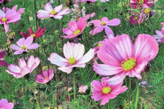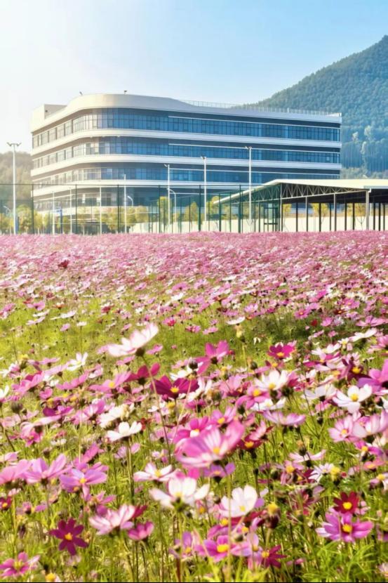 粉紫的格桑花铺成温柔地毯与现代教学楼相映成趣,抬眼是繁花,低头是春光,一步一景皆是治愈。