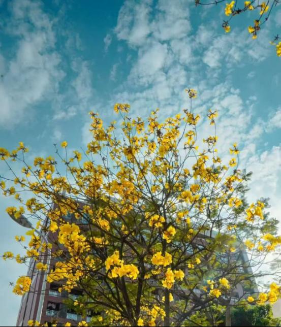 满树鎏金的风铃花缀满枝桠,在晴空下摇曳生姿把春日的暖意染进每一缕风里。