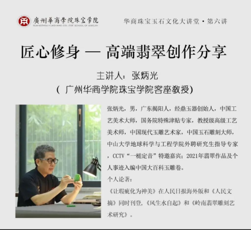 2024年10月18日,广州华商学院珠宝学院“华商珠宝玉石大讲堂”第六讲开讲。中国工艺美术大师、高级工艺美术师、中国玉石雕刻大师张炳光先生作题为《匠心修身---高端翡翠创作》的精彩演讲。张炳光是华商珠宝学院的客座教授,张大师的经鼎玉器公司是华商学院珠宝学院大学生产教融合校外实践教学基地。